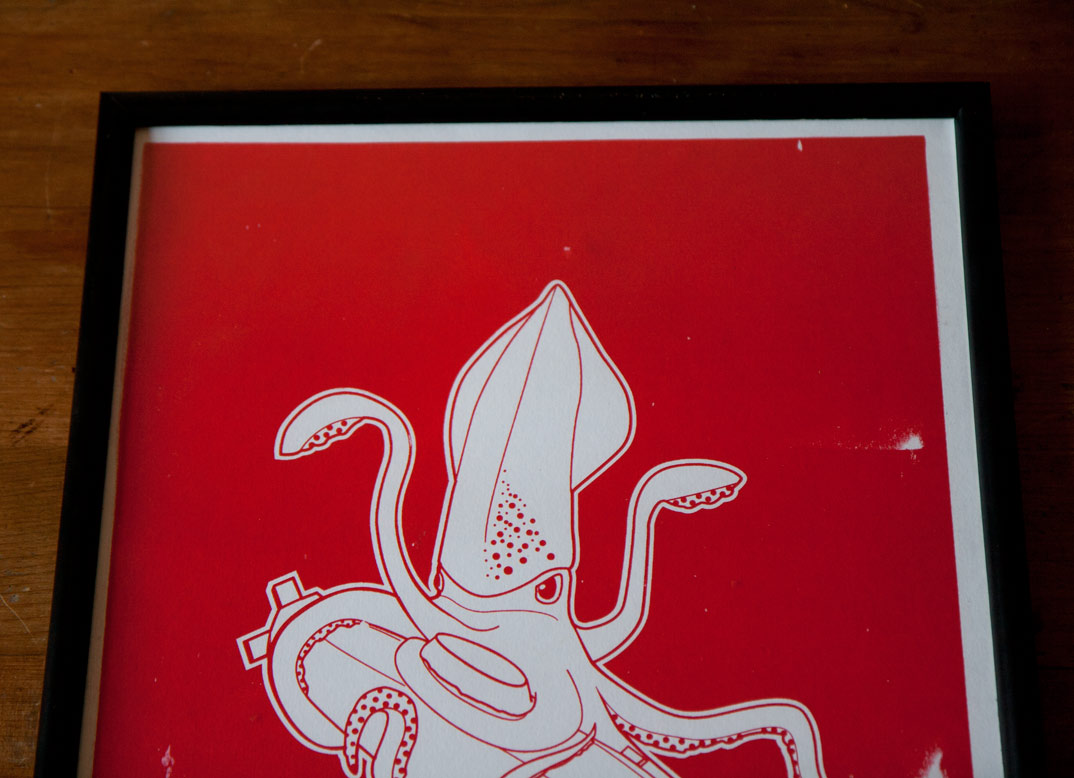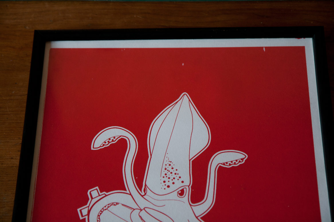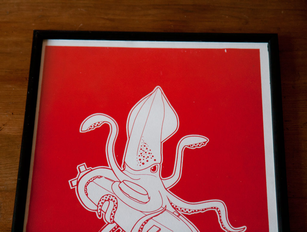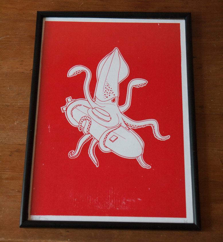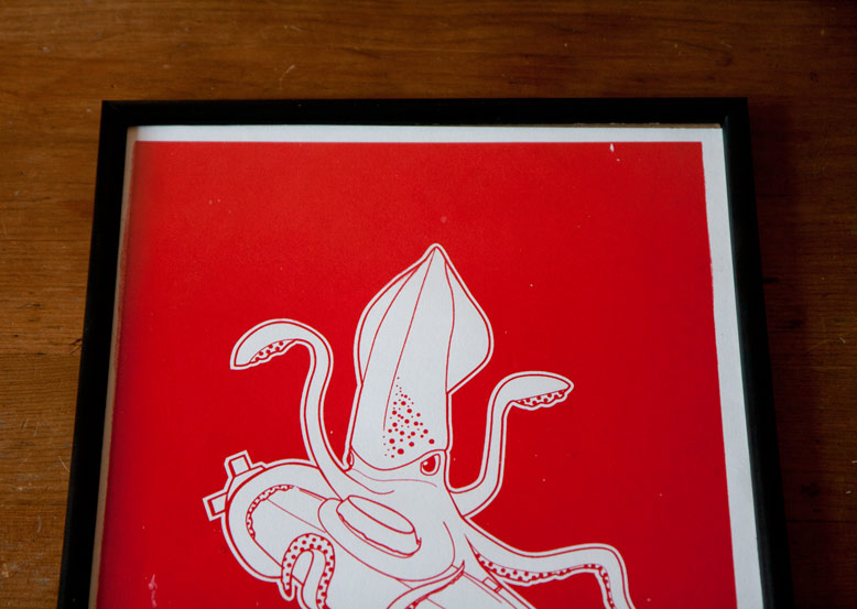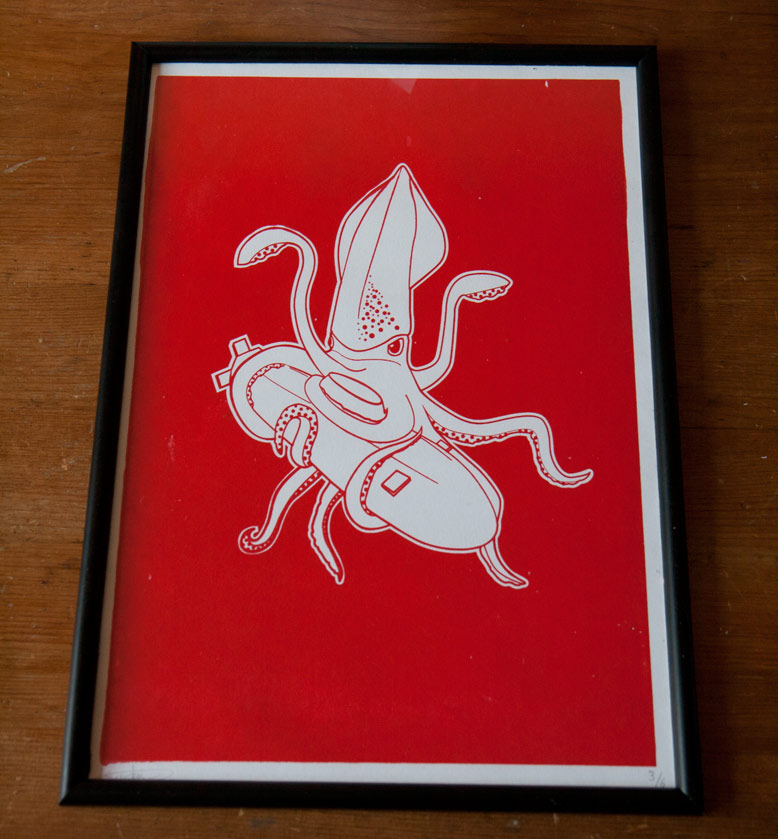 A couple of weeks ago I tried screen printing for the first time with my squid dinner illustration. Below you can see some of the results.