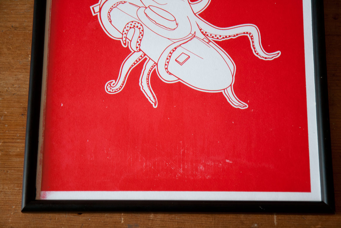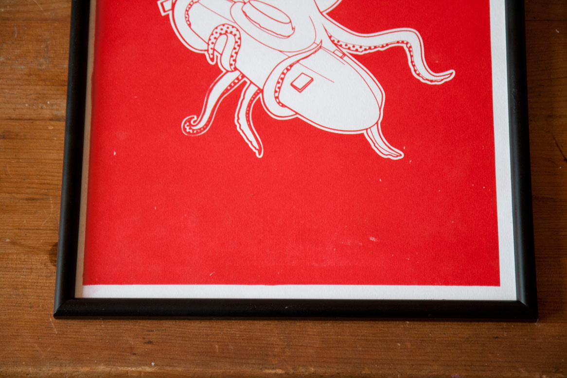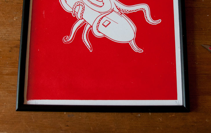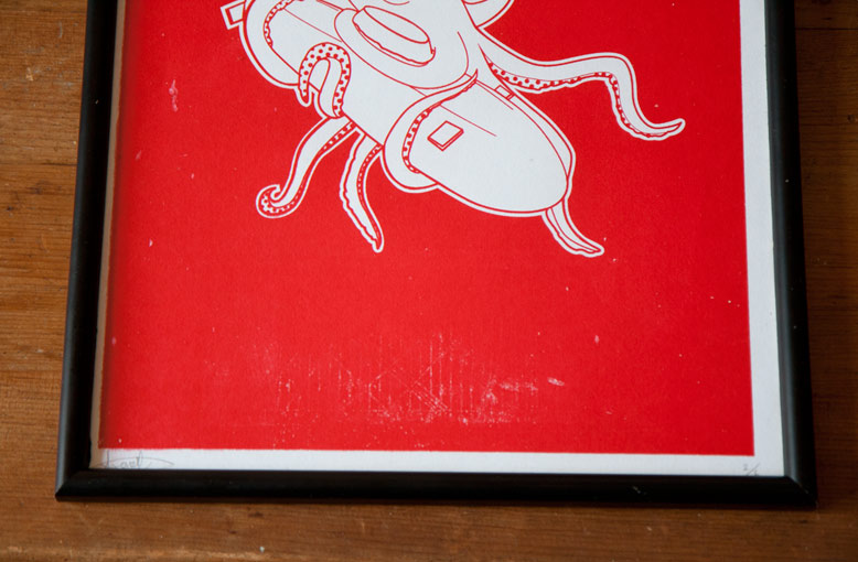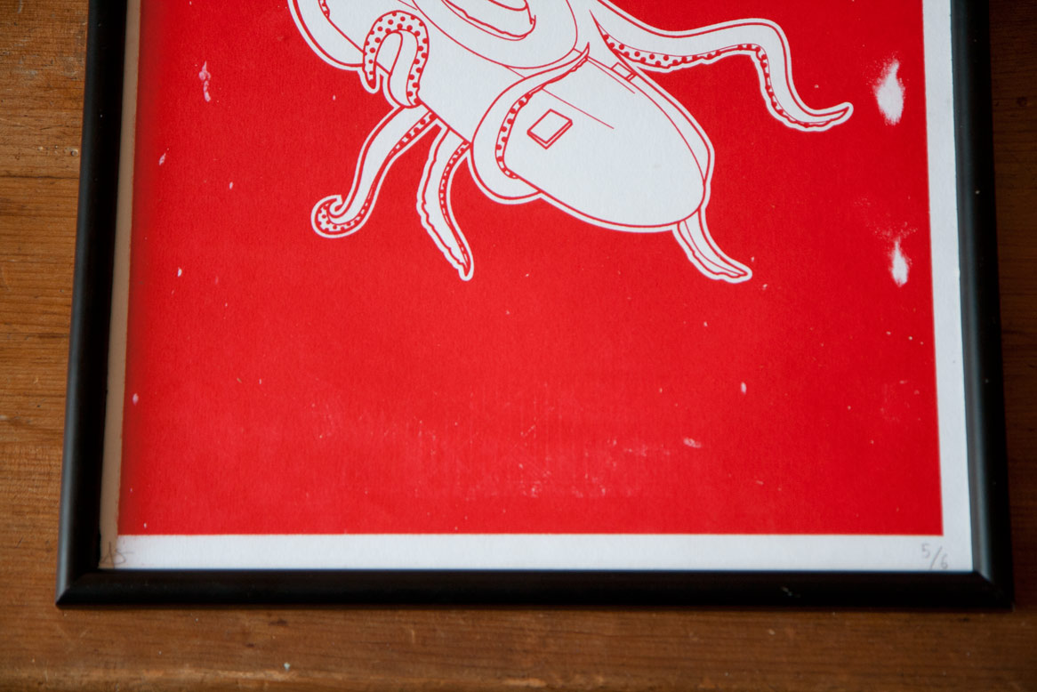 A couple of weeks ago I tried screen printing for the first time with my squid dinner illustration. Below you can see some of the results.